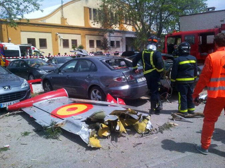 En person blev dræbt og 18 kvæstet da et militærfly fra 1960'erne i går eftermiddag ved 14-tiden styrtede ned på flybasen i Madrid-forstaden Cuatro Vientos.