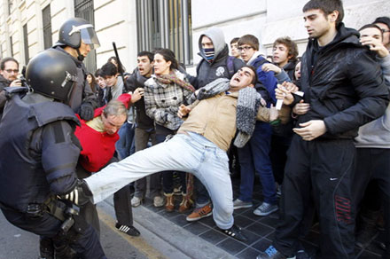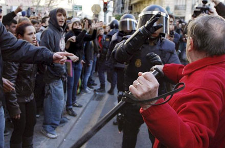 Lignende sammenstød fandt sted i Valencia i sidste uge under studenterdemonstrationer, som blot er en del af en række protester i hele Spanien mod regeringens besparelser, der blandt andet rammer skole- og sundhedsområdet.