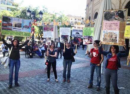 Men deres skilte ser ikke ud til at have den store effekt på de mange mennesker omkring Plaza de Toros i Granada. Enkelte tager et billede af dem, men de fleste er bare kommet for at se tyrefægtning.
