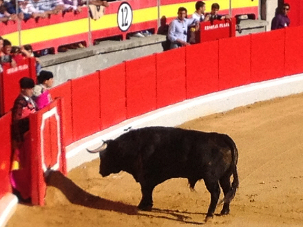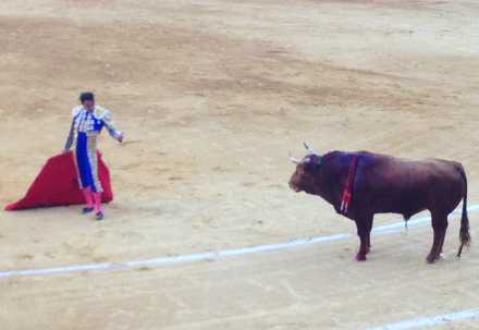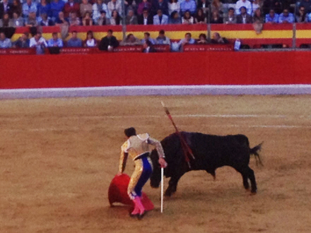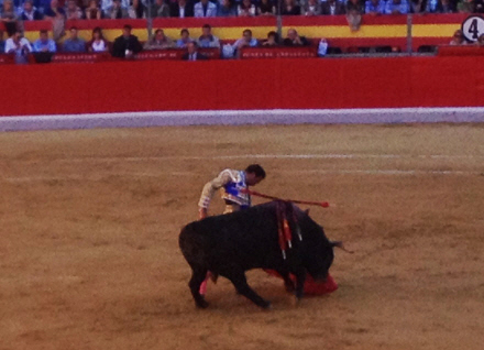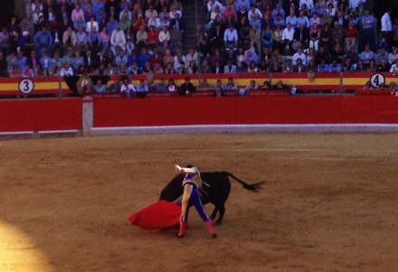 Publikum giver tydeligt tilkende, hvad der er kunst, og hvad der ikke er. Den første matador klarer det okay uden at imponere voldsomt. Efter faenaen får det store dyr dødsstødet. Jeg kan fornemme, det er på vej, for pludselig bliver der bomstille i arenaen, mens matadoren står overfor tyren med sit sværd i hånden.