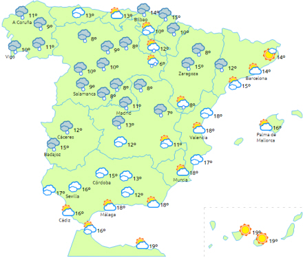 Skyet til overskyet himmel over det meste af halvøen med nedbør, undtagen i områderne langs den nordlige Atlanterhavskyst, østkysten af halvøen og Balearerne, hvor der kun vil være overskyet i perioder med mulighed for en smule let regn.