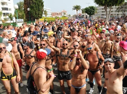 Der var tætpakket med letpåklædte mennesker i gaderne i Playa del Ingles ved årets Gay Pride.