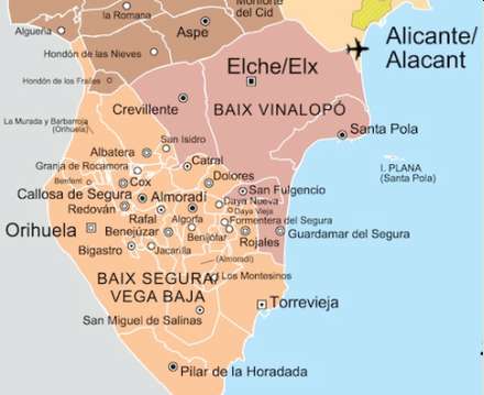 Kommunerne ligger i områderne Baix Vinalopó og Baix Segura/Vega Baja..