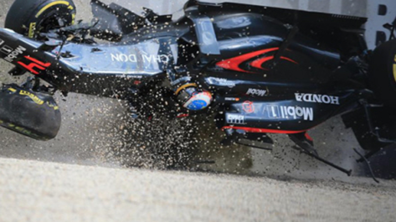 Det højre forhjul på Alonsos McLaren-racer blev straks smadret, og han mistede kontrol over bilen. Den hamrede ind i barrieren og spandt rundt i luften, før den blev stoppet af endnu en barriere.