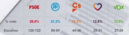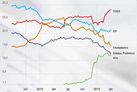 Den 23. april er der tv-debat mellem partilederne. Pedro Sánchez, PSOE, Pablo Casado, PP, Albert Rivera, Ciudadanos, Pablo Iglesias, Podemos og Santiago Abascal, VOx. Debatten sendes på LaSexta og Antena 3 samt på Onda Cero, Atresplayer og el canal internacional.
