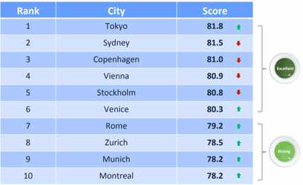 Bundskraberne blandt de 56 byer er Moskva (51,3), Kairo (51,6), Mexico City (52,6) New Delhi (54,7) og Istanbul (57,8)