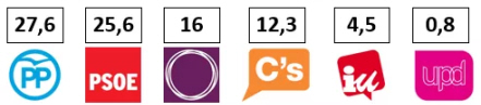 En meningsmåling, der er er cirka en måned gammel, gav det konservative regeringsparti Partido Popular et lille forspring til det socialdemokratiske PSOE. Protestpartiet Podemos ser ud til at blive det tredje største parti med støtte fra 16 procent af vælgerne.