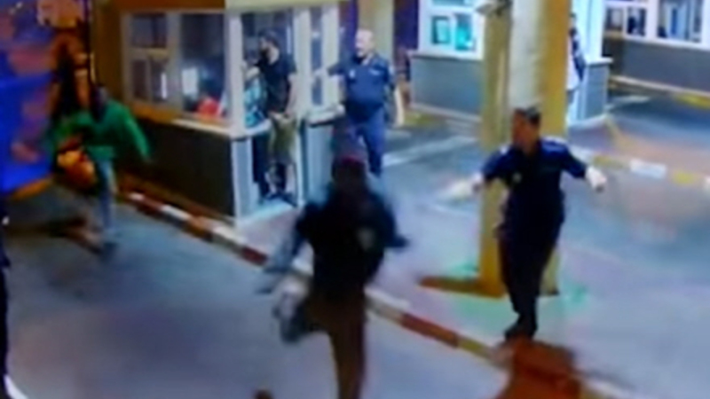 På videoen kan man tydeligt se, at betjenten desperat forsøger at sparke ud efter de løbende immigranter i forsøget på at dæmme op for indgangen, men det gik ikke godt.
