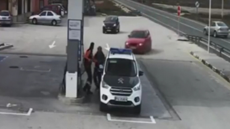 To betjente fra Guardia Civil stod ganske fredeligt og fyldte tanken i deres patruljevogn, mens en tredje kollega ventede inde i bilen.