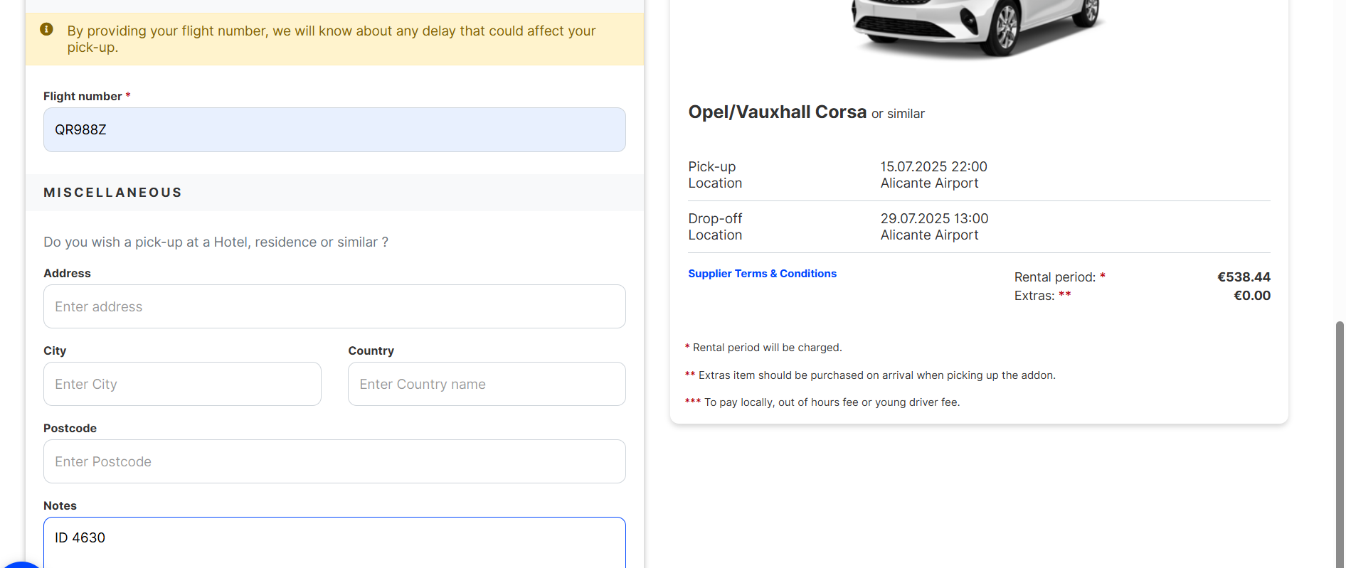 For at få rabatten, skal du efter valg af lufthavn, periode og biltype skrive dit Amigos ID nummer under ‘Notes’