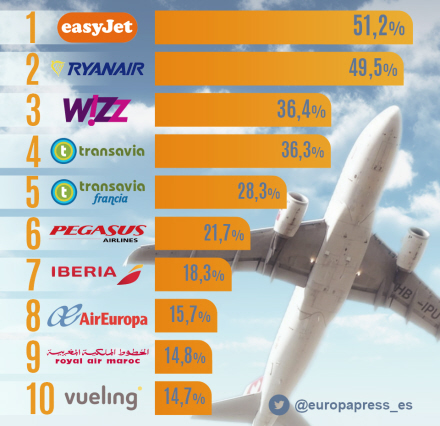 easyJet, Ryanair, Wizz Air og Transavia er de billigste flyselskaber, når man skal rejse ud af Spanien. I nævnte rækkefølge.