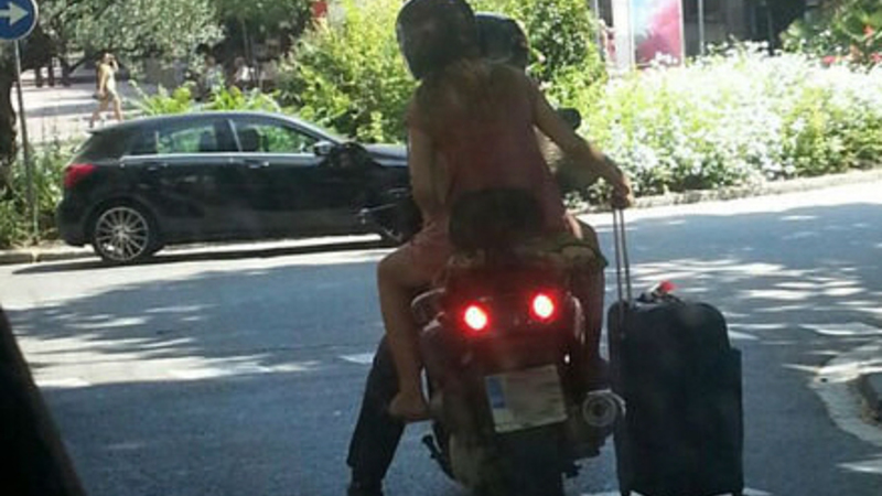 VIDEO: Ny og farlig måde at transportere en kuffert på. Med 'maleting' kan der stadig sidde to personer på scooteren.