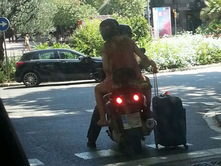 I rundkørslen ved John F. Kennedy-pladsen kørte kuffert-parret side om side med biler, busser og andre scooterer, og drejede derefter til højre ad en af de første gader uden at blinke af. De overtrådte både færdselsregler og sund fornuft.