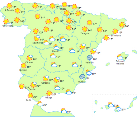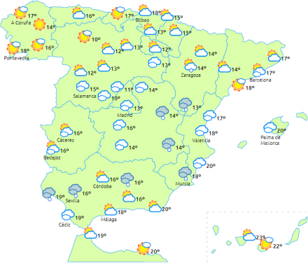 Der forventes overskyet eller delvist overskyet himmel over den sydlige del af Balearerne, den sydøstlige del af halvøen og området omkring Gibraltarstrædet med sandsynlighed for nedbør, men dog tendens til opklaring mod slutningen af dagen. I Gibraltarstrædet vil nedbøren blive ledsaget af enkelte tordenbyger.
