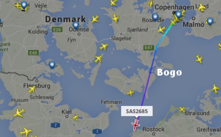 Det er et SAS-fly opereret a Cimber på vej fra Kastrup på vej til Bologna Guglielmo Marconi Lufthavnen i Italien. Det flyver i en højde af 29.425 fod, med en hastighed på 461 knob over jorden, flytypen er en Canadair CRJ-900ER, flyets registreringsnummer er OY-KFI, SAS fik flyet leveret den 21/07/2009 - det er altså 6,8 år gammelt - og hedder Rolf Viking.