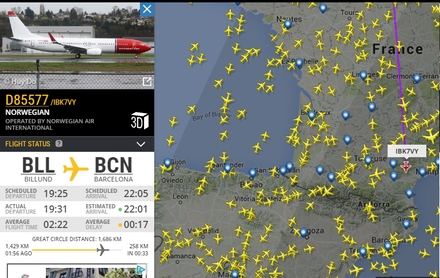 Jeg napper flynummer D85577. Det er et Norwegian-fly på vej fra Billund til Barcelona. Lige nu flyver det over Canet-de-Salars i Sydfrankrig.