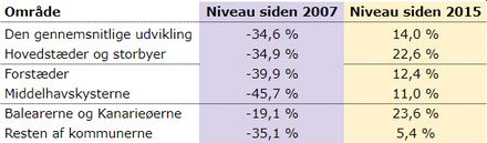 Middelhavskysterne lider fortsat det største fald siden det højeste niveau i 2007, mens Balearerne og Kanarieøerne er steget mest siden det laveste niveau i 2015. Kun hovedstæder og storbyer ligger i nærheden af samme stigning.