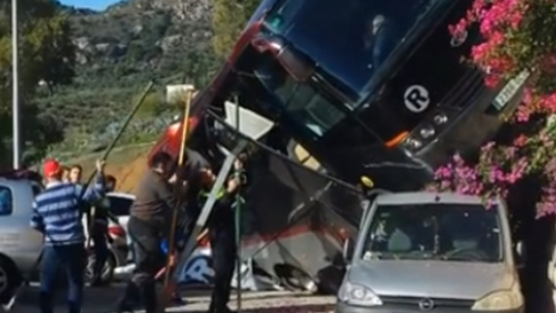 VIDEO: 25 passagerer i turistbus styrter ned ad stejl skrænt og lander oven på en personbil.