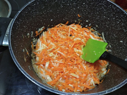 Tilsæt derefter gulerod og løg (og hakket chili, hvis du bruger det), og steg det ved middellav varme i ca. 7-8 minutter, indtil de er møre