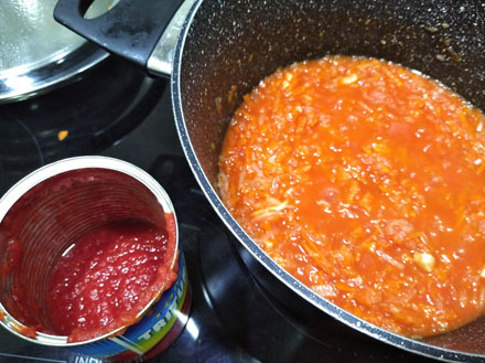 Tilsæt tomaten, sænk varmen og kog i ca. 5 minutter, smag til med salt og peber. Tilsæt derefter rom eller whisky og skru op for varmen igen, så alkoholen kan fordampe i endnu et par minutter