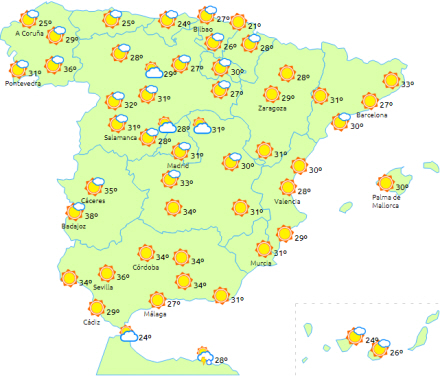 Generelt stigende dagstemperaturer på De Kanariske Øer og halvøen, bortset fra Stræde-området og langs Alboran-kysten, hvor de endda kan falde lidt. Ingen ændringer på Balearerne.