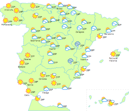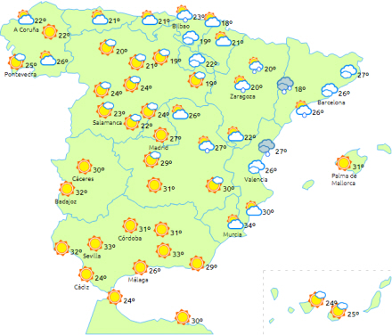 Skyet himmel med nedbør særligt ved daggry i den østlige ende af nordvestkysten, den øvre Ebro-dal, Aragón, Catalonien, Valencia, de østlige af fastlandets indre egne og også sidst på dagen i det nordlige Murcia. Lokalt kan der bliver tale om stærk eller meget stærk eller vedvarende nedbør, der kan falde som hagl. Noget tordenvejr i de berørte områder er heller ikke udelukket.