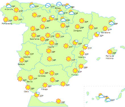 Letskyet eller klar himmel. Minimumstemperaturer i svag stigning dog uden ændringer i syd, mens maksimumtemperaturerne er i let stigning i Alicante. Dermed havner vi på noget, der ligner 31 til 34 grader og 18 til 22 i nat.