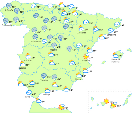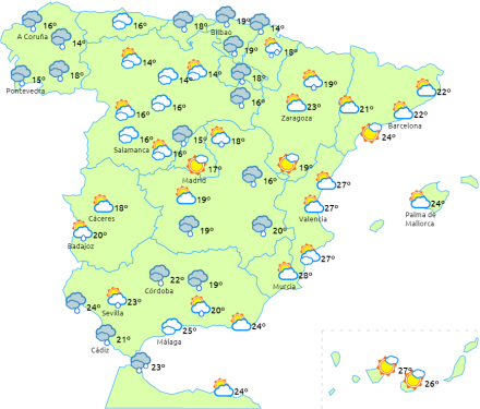 Koldfront trænger ind over halvøens nordvestlige hjørne, og det giver regn, byger og lejlighedsvist tordenbyger i Galicien, Cantabrien, de indre egne i nord, den øvre Ebro-dal og Pyrenæerne, men de er mere intense og hyppige i dagens anden halvdel.