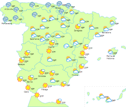 I store dele af den nordlige halvdel af halvøen, Castilla-La Mancha, det nordøstlige Andalusien og De Baleariske Øer begynder dagen skyet eller overskyet med regn, men der er tendens til opklaring i løbet af dagen.