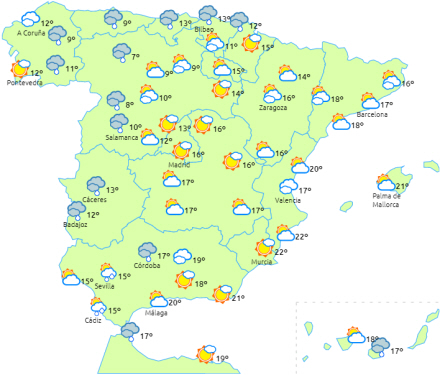 Faldende temperaturer i dagtimerne i Galicien, Cantabrien, Andalusien og De Kanariske , mens de stiger i halvøens indre egne og få ændringer i resten. Vi ligger lavere end normalen for årstiden på De Kanariske Øer og højere end normalen i den østlige halvdel af halvøen og på De Baleariske Øer.