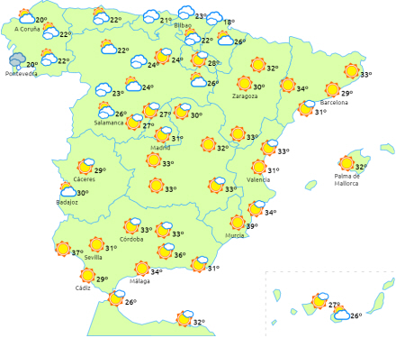 Udbredelsen af let skyet eller klaret himmel, undtagen i Galicien, Cantabrian og den nordlige del af De Kanariske Øer, hvor der vil være rigelige lave skyer om morgenen. I løbet af dagen vil der være en sky af evolution i det halvø indre, og der vil være brusere og storme i de bjergrige systemer i centrum og øst, der kan strække sig til de omkringliggende områder.