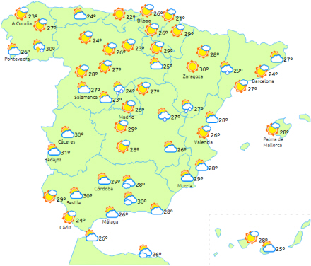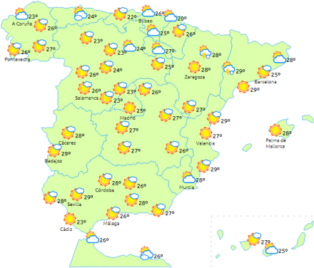 Faldende dagstemperaturer på den nordlige del af halvøen og den vestlige del af Andalusien, mens der sker få ændringer i resten.