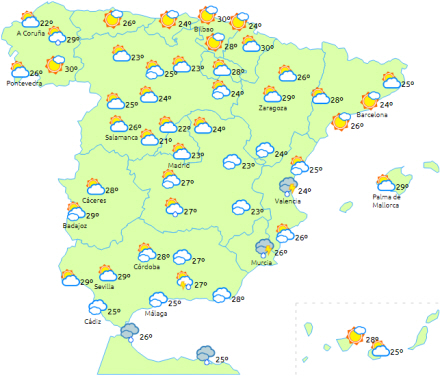 Overskyede i perioder på den nordlige halvdel af fastlandet med lejlighedsvise byger og tordenvejr især i dagtimerne, og det er mest sandsynligt i bjergområder og mest intenst i de sydlige af De Iberiske Randbjerge og Pyrenæerne.