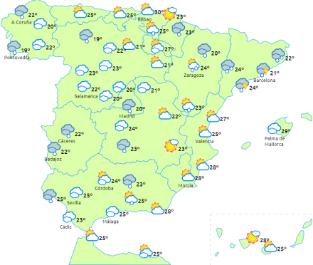 I dag forventes der byger og tordenvejr - måske endda hagl - især i halvøens indre områder, Pyrenæerne, Levante og i Costa del Sol-regionen, men vi kan dog heller ikke udelukke andre områder af halvøen.