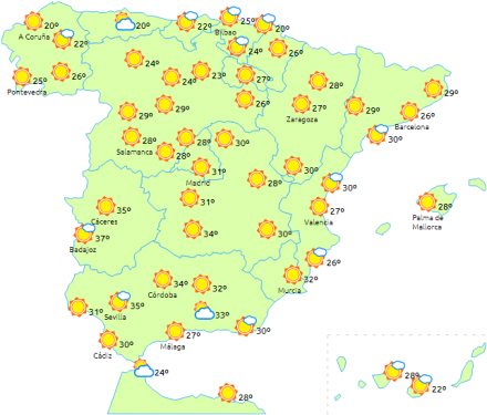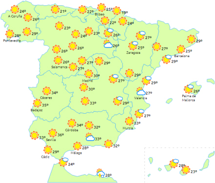 I nord og øst er det overskyet i perioder med tendens til opklaring i løbet af eftermiddagen. I resten letskyet eller klart. Temperaturer med få ændringer eller i svag stigning på 21 til 25 grader.
