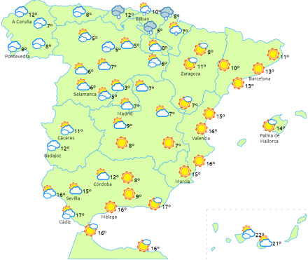 Skyet eller overskyet med nedbør i nordvest og de vestlige Pyrenæer. Tiltagende skydække i Galicien med nedbør som dagen skrider frem, og det kan efterhånden brede sig i en svagere og mere spredt form til resten af den nordvestlige del af halvøen i slutningen af dagen.