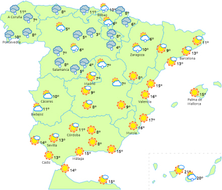 Lokalt vedvarende nedbør ved nordvestkysten og forventet snefald i den nordlige del af halvøen. Frost i Pyrenæerne, De Iberiske Randbjerge og i Guadalquivir. Stærk vind i perioder langs nordvestkysten og i Middelhavsområdet.