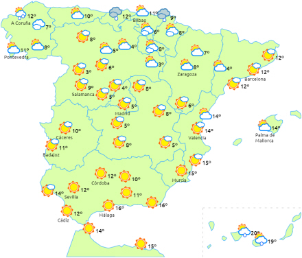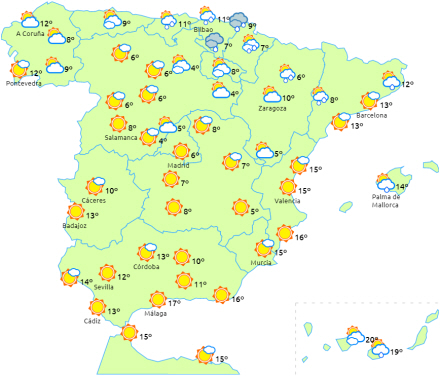 Dagstemperaturerne ændrer sig kun lidt, mens nattemperaturerne har tendens til at stige i den sydlige halvdel af halvøen og få ændringer eller lette fald i bjergrige områder i den nordlige halvdel. Den udbredte frost fortsætter i halvøens indre egne, som stadig stærk kan være tung i den østlige del af Castilla-La Mancha og i den sydlige del af De Iberiske Randbjerge - lokalt ned til otte minusgrader.