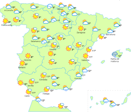 Lokalt tung frost i bjergene og de indre egne, mens der advares om kraftig blæst i perioder ved kysterne i Galicien og Catalonien og på De Baleariske Øer.