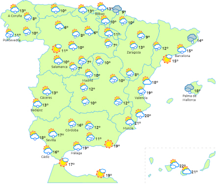 Stigende dagstemperaturer i stort set hele landet, undtagen i områder af den sydvestlige del af halvøen, hvor der vil være få forandringer. Også stigende nattemperaturer - lokalt ret bemærkelsesværdige. Svag frost forventes kun i Pyrenæerne og pletvis i bjergene i den nordlige og sydøstlige halvdel.