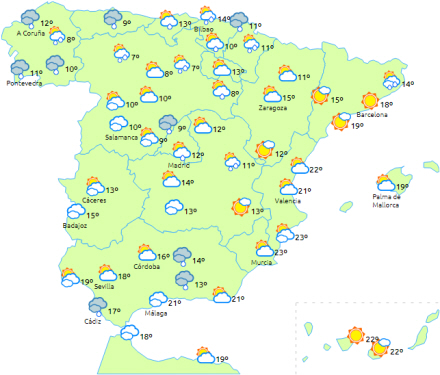 Sandsynlighed for lavthængende skyer og morgentåge i de indre egne fra nord til syd og i Guadalquivir-dalen.