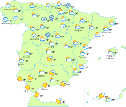 Stigende dagstemperaturer og ellers kun mindre ændringer, så havner på 14 til 19 grader og otte til 13 i nat. Vind fra sydøst i de indre egne med lejlighedsvist meget kraftige vindstød i Antequera-provinsen. Let østenvind på kysten.