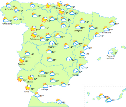 Stigende dagstemperaturer ved nordvestkysten, mens natniveauerne stiger på De Baleariske Øer, nordvestkysten, Ebro-dalen, de nordlige indre egne og Castilla-La Mancha. Få forandringer i resten af landet.