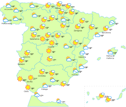 Morgentåge flere steder og sandsynlighed for calima i højtliggende områder. Faldende minimumstemperaturer og stigende maksimumtemperaturer undtagen i den sydlige tredjedel, hvor de falder. Dermed havner vi på 13 til 18 grader og otte til 12 i nat.