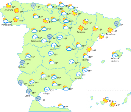 Overskyet i perioder over i resten af halvøen og De Baleariske Øer med mulighed for nogle byger eller generelt svage tordenbyger.