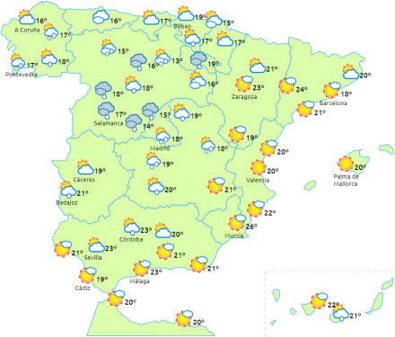 På resten af halvøen og De Baleariske Øer begynder dagen letskyet, men efterhånden i løbet af dagen tiltagende skydække fra sydvest til nordøst.
