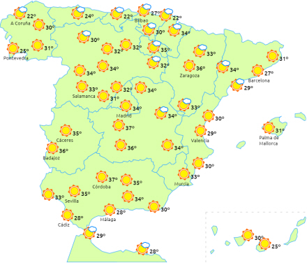 Temperaturerne falder på De Kanariske Øer, selv om de stadig kan nå op på 34 grader i de bjergrige egne i syd og vest. Dagstemperaturerne vil også falde i Pyrenæerne og det østlige Catalonien og stige i resten af den nordlige del af Den Iberiske Halvø. Kun få ændringer i resten.