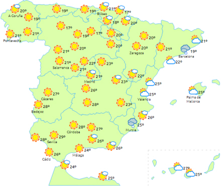 Faldende dagstemperaturer til den nordlige halvdel af fastlandet og i Extremadura - ret bemærkelsesværdigt fald i de indre egne og helt ekstraordinært i den øvre Ebro-dal. Få ændringer i resten.