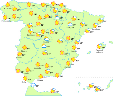Perioder med stærk vind i Ampurdán og på De Kanariske Øer. Betydelig høje temperaturer lokalt på halvøens sydvestlige egne.