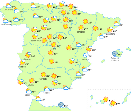 Overvejende letskyet eller klart i resten af landet med nogle højtliggende skyer over den vestlige del af halvøen og De Kanariske Øer, og perioder med lavtliggende skyer eller morgentågebanker i det østlige Cantabrien og Ebro-dalen.